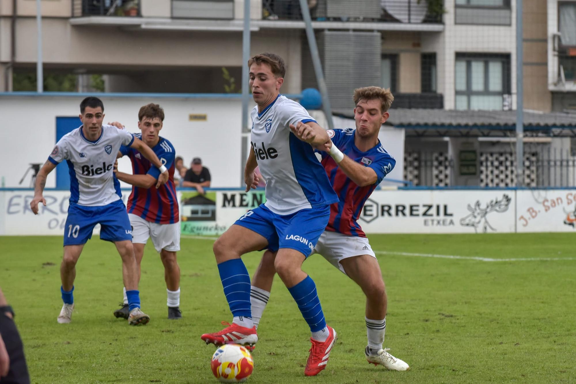 Gizonek, berriz, igande arratsaldean Derio hartu zuten etxean, Espainiako Hirugarren Mailako ligako laugarren jardunaldian. Lehen hogei minutuetan nagusitasun argirik ez zen ikusi zelaian, baina, handik aurrera, Lagun Onakekoak arerioei gain hartzen hasi ziren, eta 28. minutuan etxekoentzako aurrena sartu zuen Unax Odriozolak area kanpotik egindako jaurtiketa batean. Horren atzetik, aukerak bata bestearen atzetik sortu zituzten Azpeitikoek, baina golik ez, eta horrela, 1-0ekoarekin iritsi ziren atsedenaldira. Bigarren zatian ere bide beretik jarraitu zuen partidak, eta 52. minutuan penalti bat huts egin zuten arren, hurrengo jokaldian Lander Petxarromanek bigarrena sartzea lortu zuen. Hirugarren gola, berriz, neurketa bukatzeko bost minuturen faltan etorri zen. Area barruko jokaldi nahasi batean, baloia euren atean sartu zuten Deriokoek.
