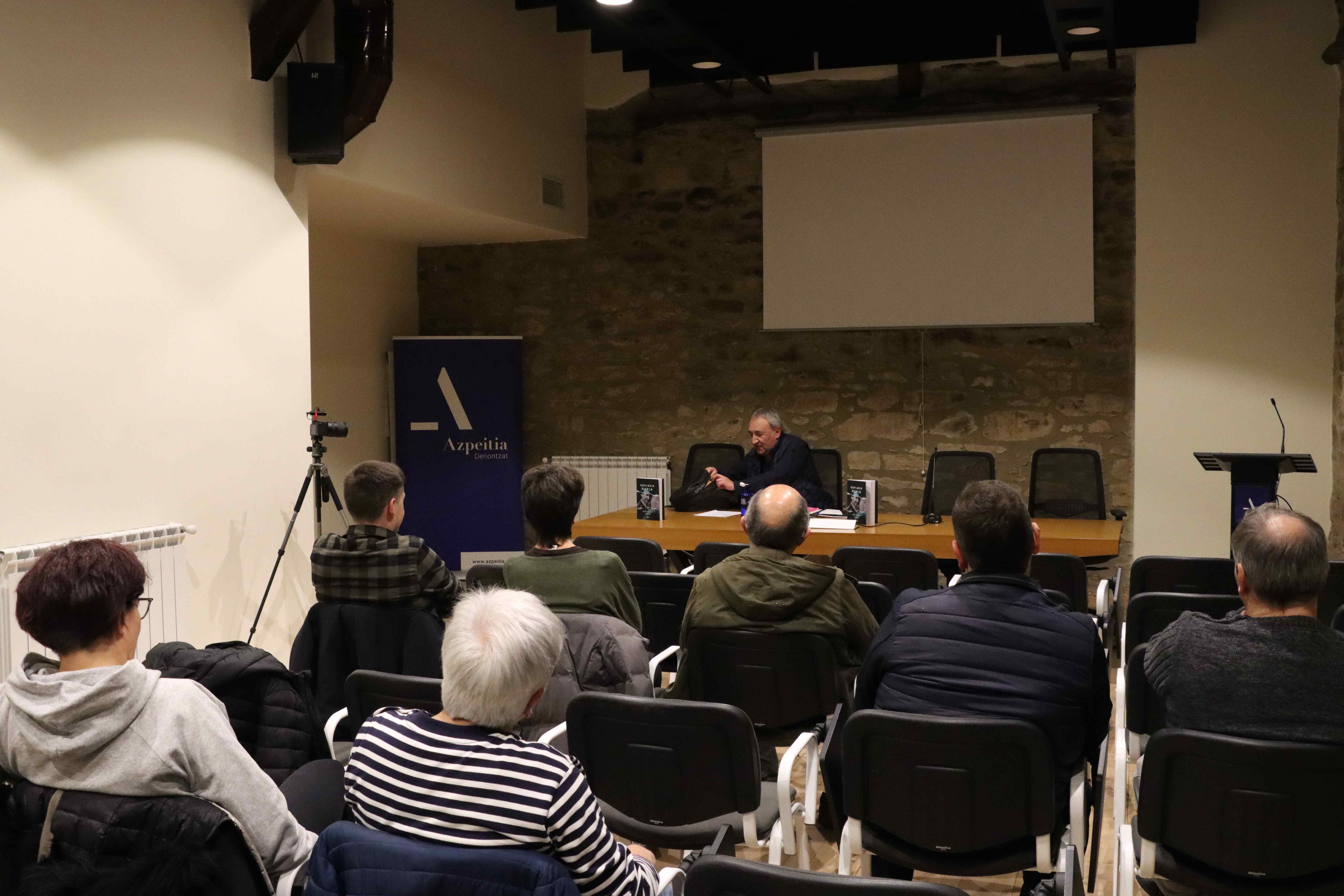 Goian, Leturia eta hitzaldira joandako ikus-entzuleak. Behean, egilea liburuaren aleak sinatzen. (Argazkiak: Trikigiro)