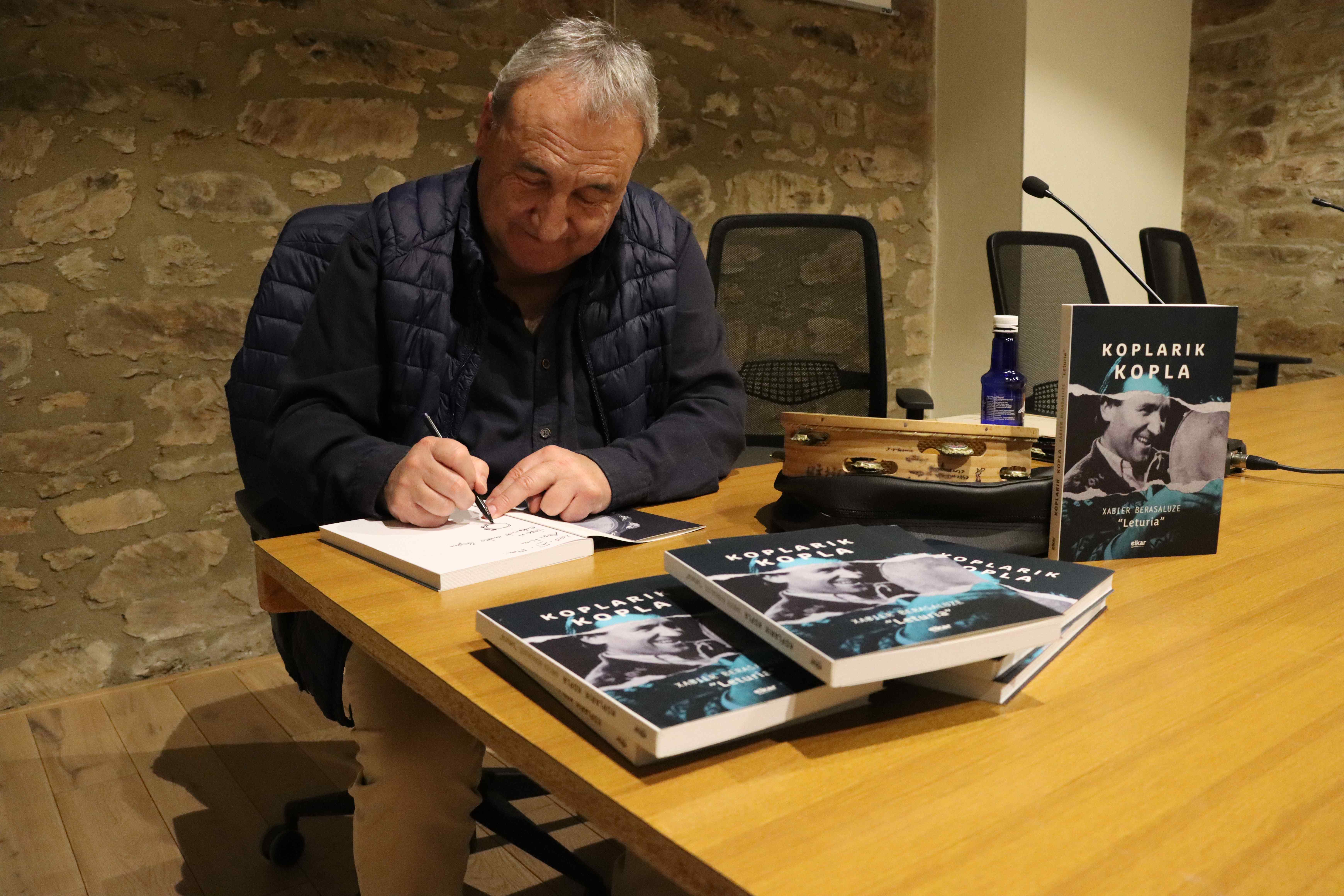 Labetik atera berria du Xabier Berasaluze Leturia-k Koplarik kopla, eta argitalpena oraindik epel dela ekarri zituen atzo liburuaren hainbat ale Azpeitira, Trikigiro elkarteak antolatutako aurkezpenerako; egileak sinatuta eraman zituzten etxera horietako batzuk aurkezpenera joandakoek.