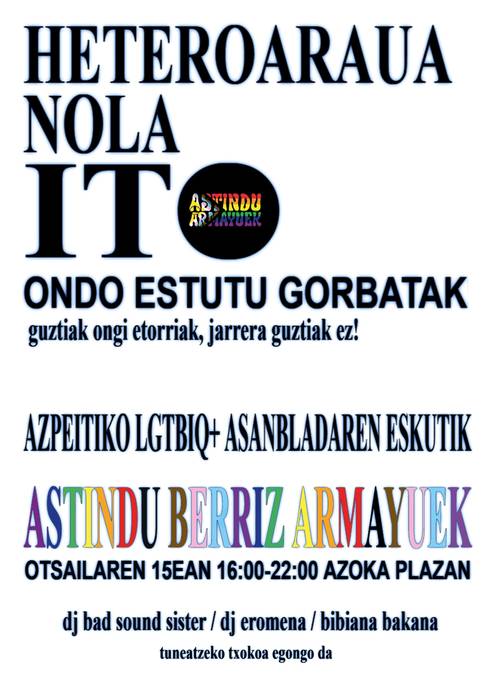 Ibilian-ibilian karnabalak heldu zaizkigu berriro, maskarak beste behin eranzteko eguna. Oraindik ere, ezinbestean, behar-beharrezkoa iruditzen zaigu Elegante Egunean espazio askeak aldarrikatzea eta horretarako alternatibak sortzea. Dagoeneko, ordea, ez gara armairuak astintzearekin soilik konformatuko; orain, hautsi egin nahi ditugu. Hanka bat armairuan eta bestea kanpoan duzuenok, sekula bertatik ateratzeko adorerik izan ez duzuenok, inoiz hara itzuliko ez zaretenok, handik atera nahi dutenen makulu zaretenok… Azoka Plazan behar eta nahi zaituztegu.