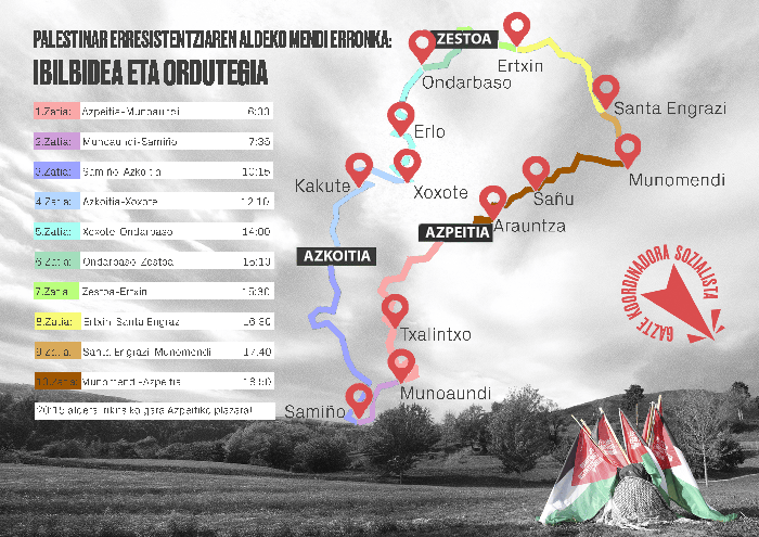 Datorren larunbatean, azaroaren 1ean, Palestinako erresistentziaren aldeko mendi erronkaren ibilbidearen berri eman du Urola Erdiko GKSk. Eskualdeko 11 tontor igaroko dituzte, 06:00etan Azpeitiko plazatik abiatuta.