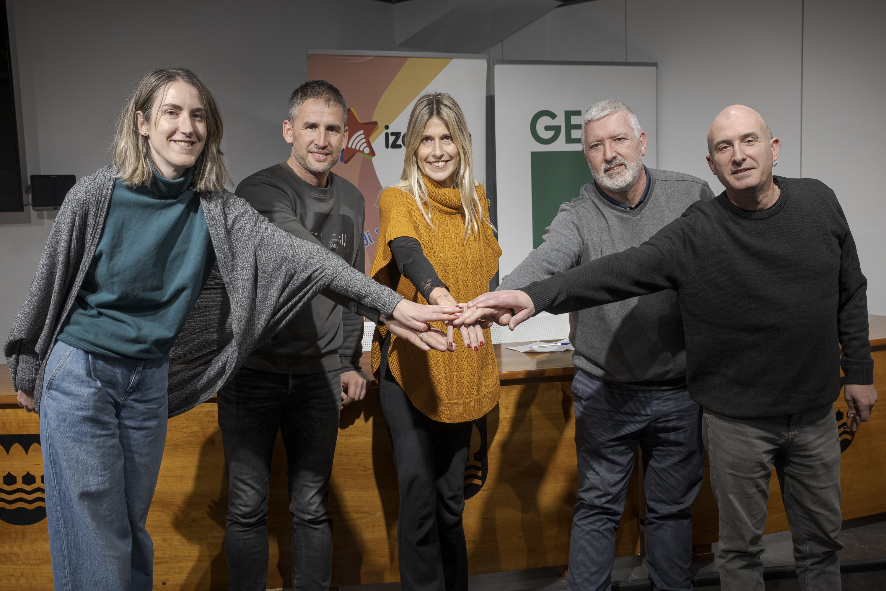 GEPFren, Tokikomen, Goienerren, Izarkomen eta Hamaika Telebistaren ordezkariak, joan den ostegunean, Donostian. (Gari Garaialde/Bostok Photo)
